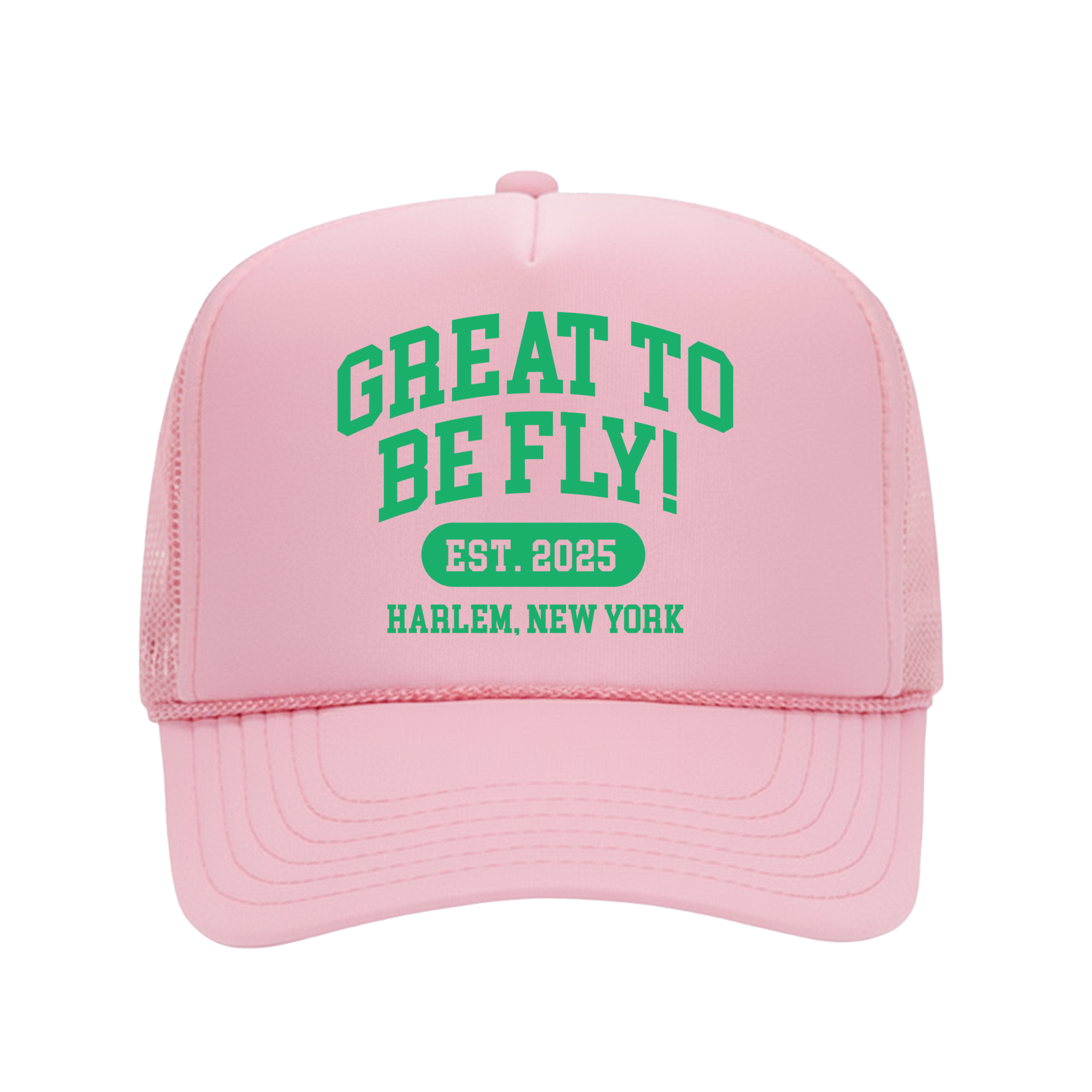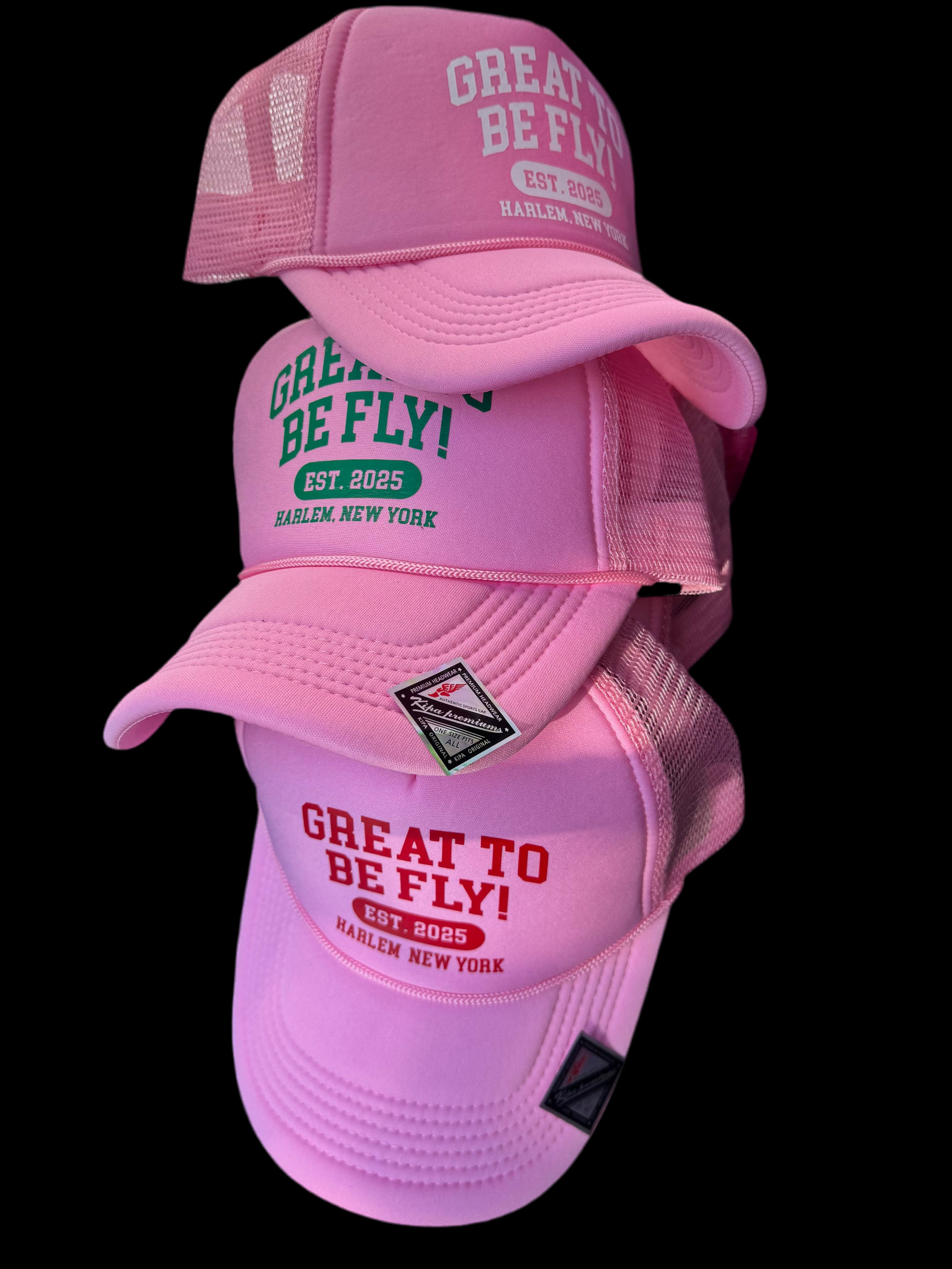 Our βGREAT TO BE FLY!β truckers just dropped in 3 limited-edition colorways β green, white, and red print on pink.