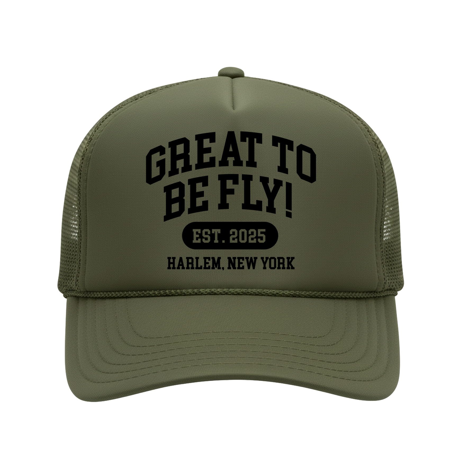 Rep your fly with pride. This oliv trucker hat features black lettering that pops with unapologetic confidence. Designed for the culture, this cap proudly declares “GREAT TO BE FLY!”—a reminder that being dope is a lifestyle.